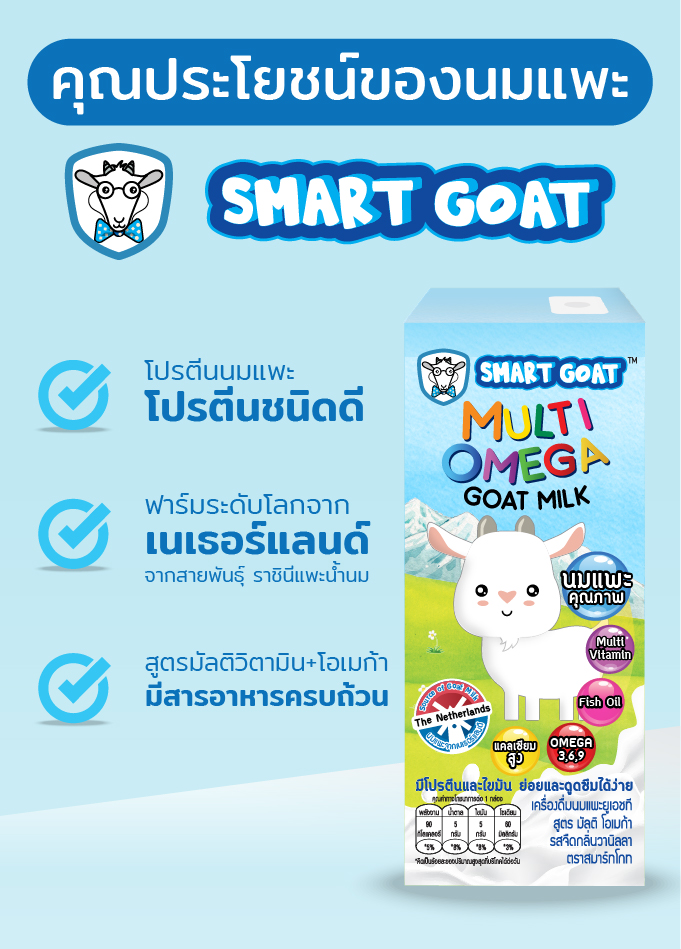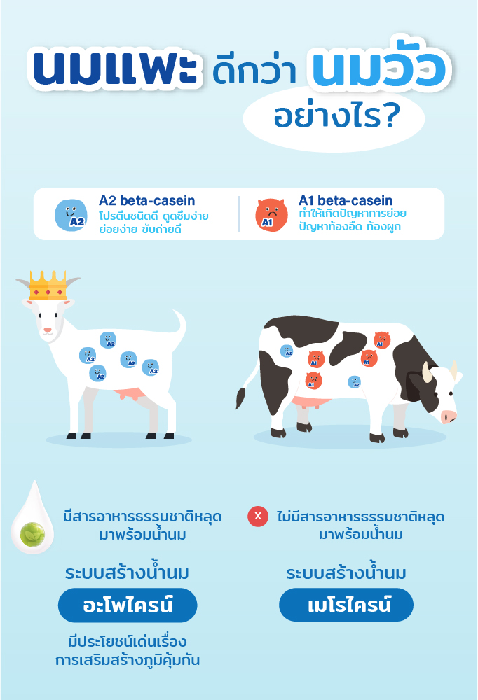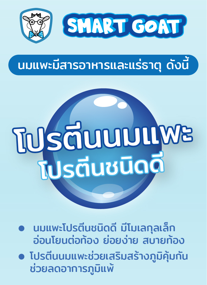 - นมแพะมีโปรตีน CPP โปรตีนอ่อนนุ่ม อ่อนโยนต่อท้อง และเป็นโมเล็กกุลเล็ก ที่ย่อยง่าย
